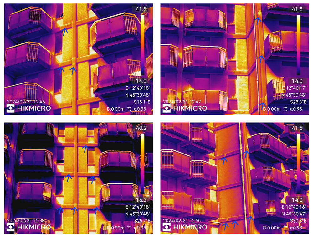 Conclusions: The investigation enabled the detection of the detached portions of the concrete covers in a very sharp manner due to the high thermal resolution of the thermal imaging camera used. The surveys were acquired with standard optics. A wide-angle lens was also employed during the survey to enable the thermal anomalies on the investigated elevations to be appreciated with great speed. The high thermal resolution combined with the frequency of acquisition allowed the detection of thermal anomalies even when employing a wide-angle lens.