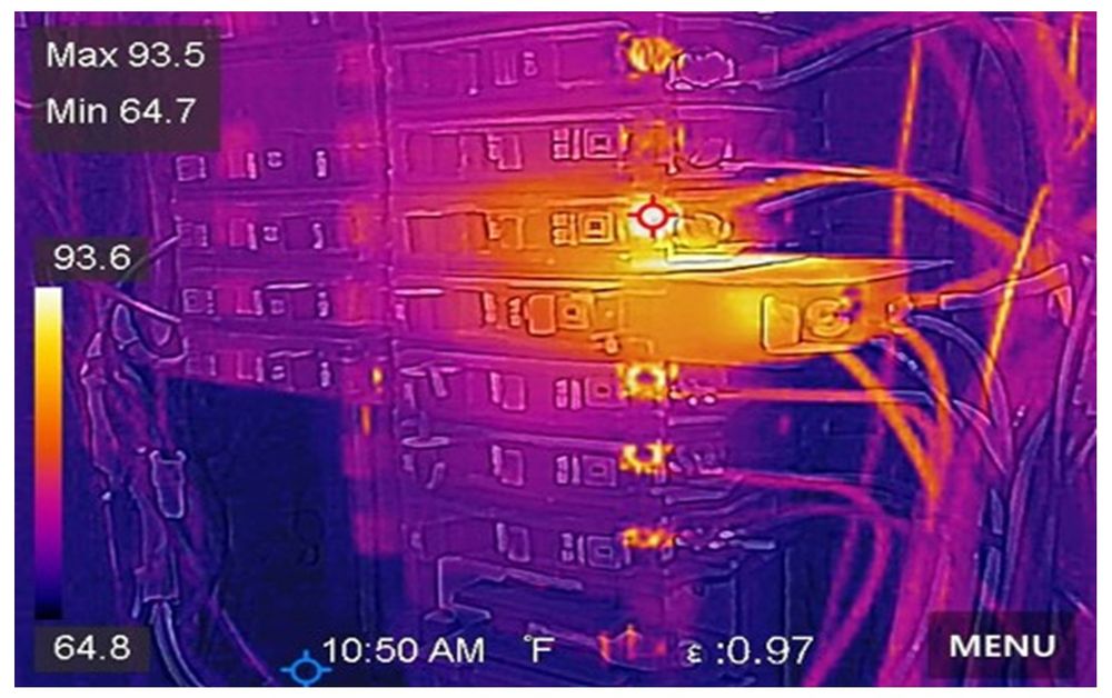 A thermal imaging camera can identify issues with suitably modified electrical control panels by detecting abnormal temperature patterns. Hotspots on components such as circuit breakers, fuses, terminals and connections indicate potential problems such as loose connections, overloading or faulty components.