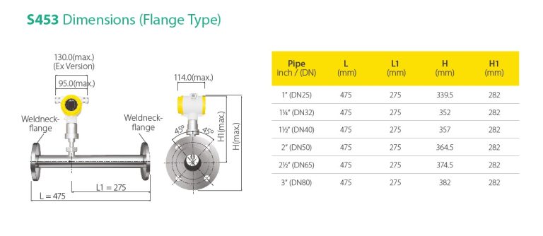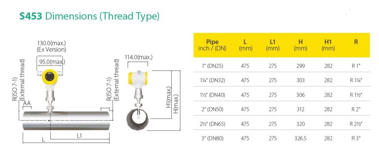 S453 plūsmas mērītājs atbalsta cauruļu diametrus no DN25 līdz DN80 ar vītņotiem vai atlokiem savienojumiem. Tas darbojas pie spiediena līdz 5,0 MPa neeksplozīvi drošām versijām un līdz 1,6 MPa versijām, kas sertificētas bīstamām zonām.