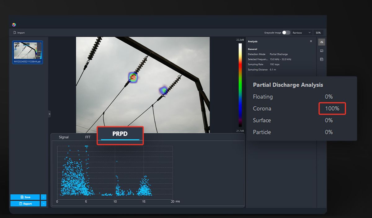 Partial Discharge Analysis – Analyzer Acoustic software utilizes field images and data to classify the type and severity of the partial discharge.