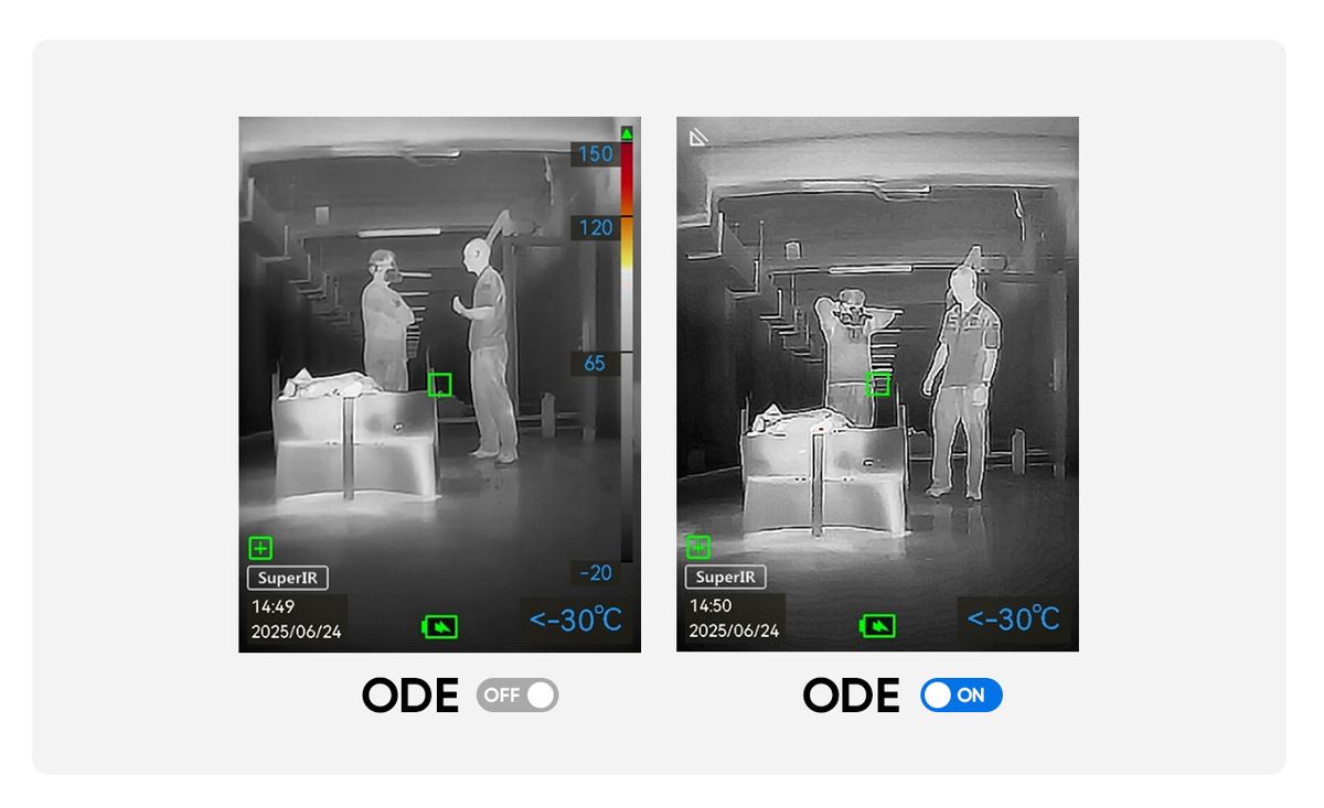 Enhance outline of certain targets with ODE – False-color thermal overlays are based on temperature mapping, which flattens visual details in hot areas. ODE enhances clarity without altering the thermal data. HIKMICRO FP21 with this function enabled, target outline will be clearer, but noise of the image will be increased accordingly.
