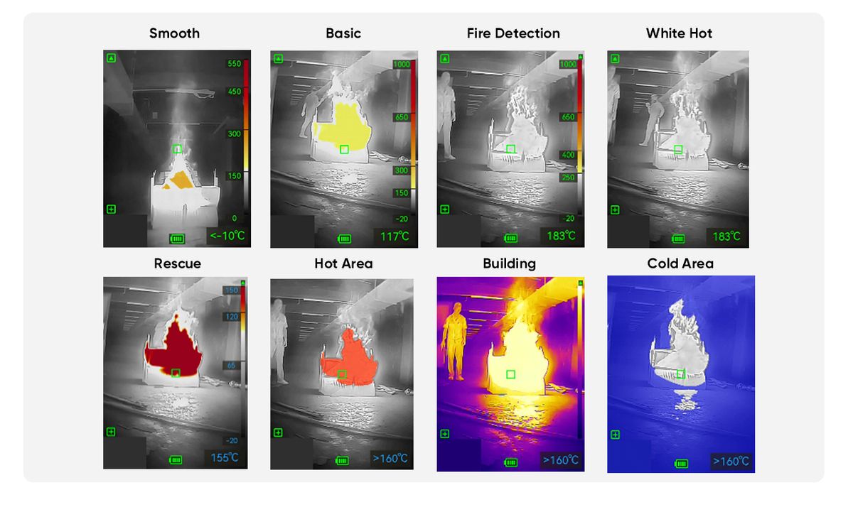 | Color Palettes | Basic, Smooth, White Hot, Fire Detection, Rescue, Hot Area, Cold Area, Building |