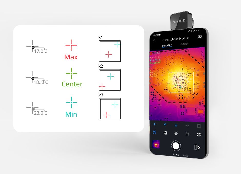 Quick Temperature Measurement – Full screen measurement: Center Spot, Hot Spot, Cold Spot, 3 Custom Spots and 3 Areas.