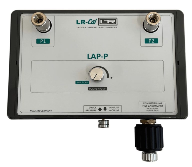 Due to the integrated electric pump, the LR-Cal LAP-P enables automatic and exact test pressure generation with the option of switching to vacuum generation. For precise adjustment for accurate comparison testing, the LR-Cal LAP-P electric pressure test pump is equipped with a fine adjustment valve.