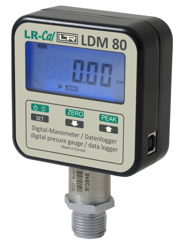 As standard, the LR-Cal LDM 80 digital reference pressure gauge and data logger is equipped with a USB interface. Optionally, the data can be transmitted wirelessly, to a PC or laptop. An optional version with pressure switch test function and connection is also available.