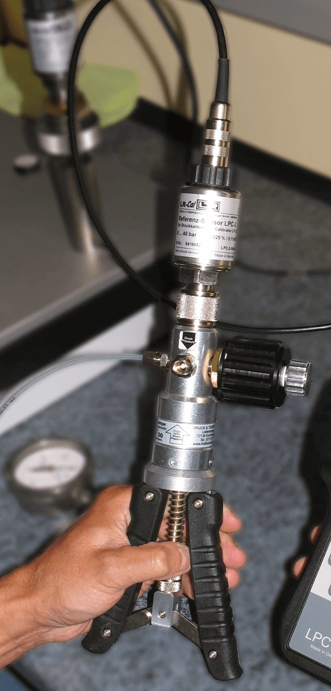The LR-Cal LPP 40 pressure test pump is used to generate pressure for checking, adjusting and calibrating mechanical and electronic pressure measuring instruments by comparative measurement. These pressure tests can be carried out on a mobile basis, on site at the measuring point, or stationary in the laboratory or workshop.