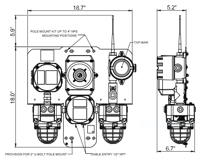 The TXP-WABX Wireless Alarm Bar is a notification device suitable for Class 1, Division 2 applications. The TXP-WABX communicates directly with TXP-WTA transmitters as well as TXP-WCR and TXP-C16X control panels via 900 MHz radio signal. The onboard horn provides a nominal output of 112 dBA with field customizable volume control and has 64 different tones available. The amber and red Xenon strobes provide 360° visibility of low and high alarm status. A pole mount kit is included and is compatible with diameters up to 4″. With a low profile and lightweight form factor of 33 pounds, this device can be easily transported and installed in remote or hard-to-reach areas.