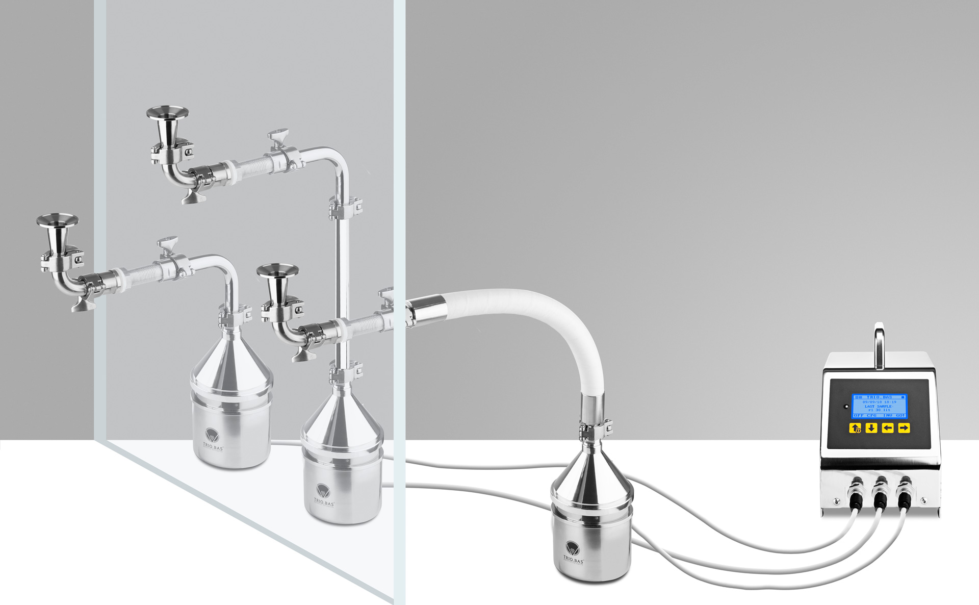 TRIO.BAS stainless steel satellites represent an ideal solution for operation in RABS and isolators, as the sampled air remains inside the closed cabinet volume and does not require additional exhaust.